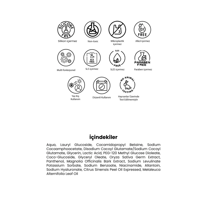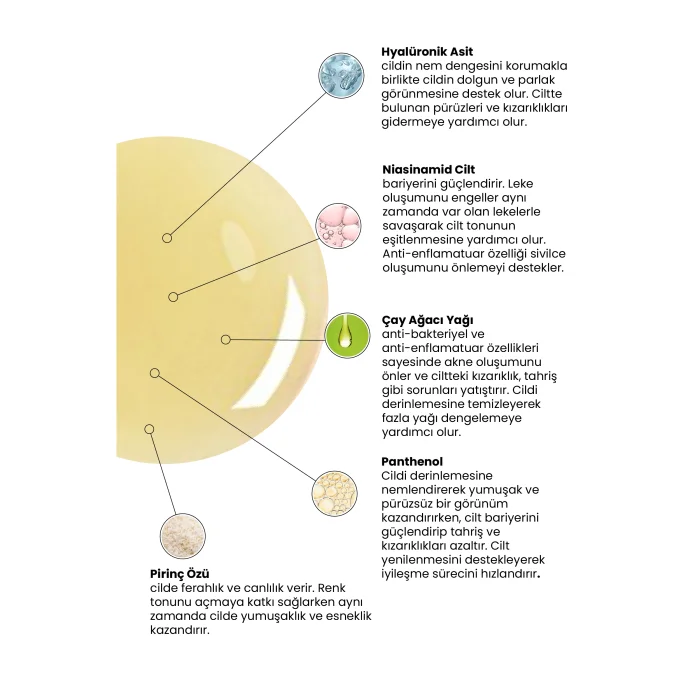 Hyalüronik Asit: Cildin nem dengesini korumakla birlikte cildin dolgun ve parlak görünmesine destek olur. Ciltte bulunan pürüzleri ve kızarıklıkları gidermeye yardımcı olur.