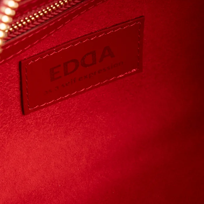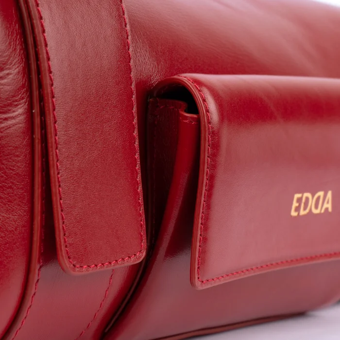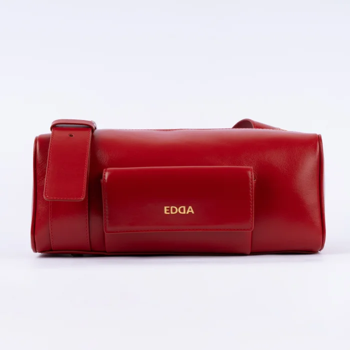 Square prism bag in red calf leather with zipper closure, adjustable shoulder strap, one side pocket with magnetic closure, internal pocket with zip, red stitching, and gold logo at the front. Complete with internal red velvet lining.