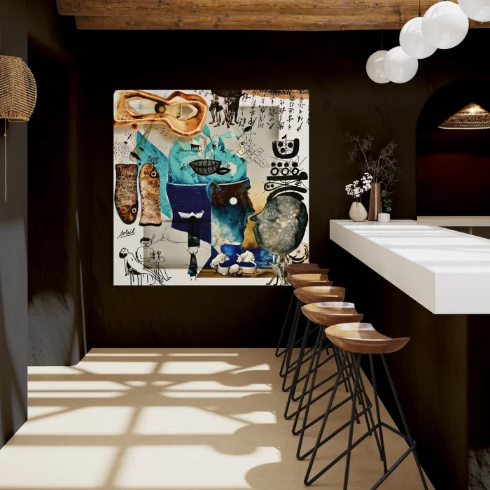 The artwork "Since" offers a wide range of symbols, ranging from mental depth represented through the figure of an inner thinker, to images of a woman oozing while drinking wine. This work manages to draw the viewer into different emotional layers by focusing on the intellectual difficulties of men and women from the past to the present, with examples of symbolism embroidered with modern figures standing side by side.