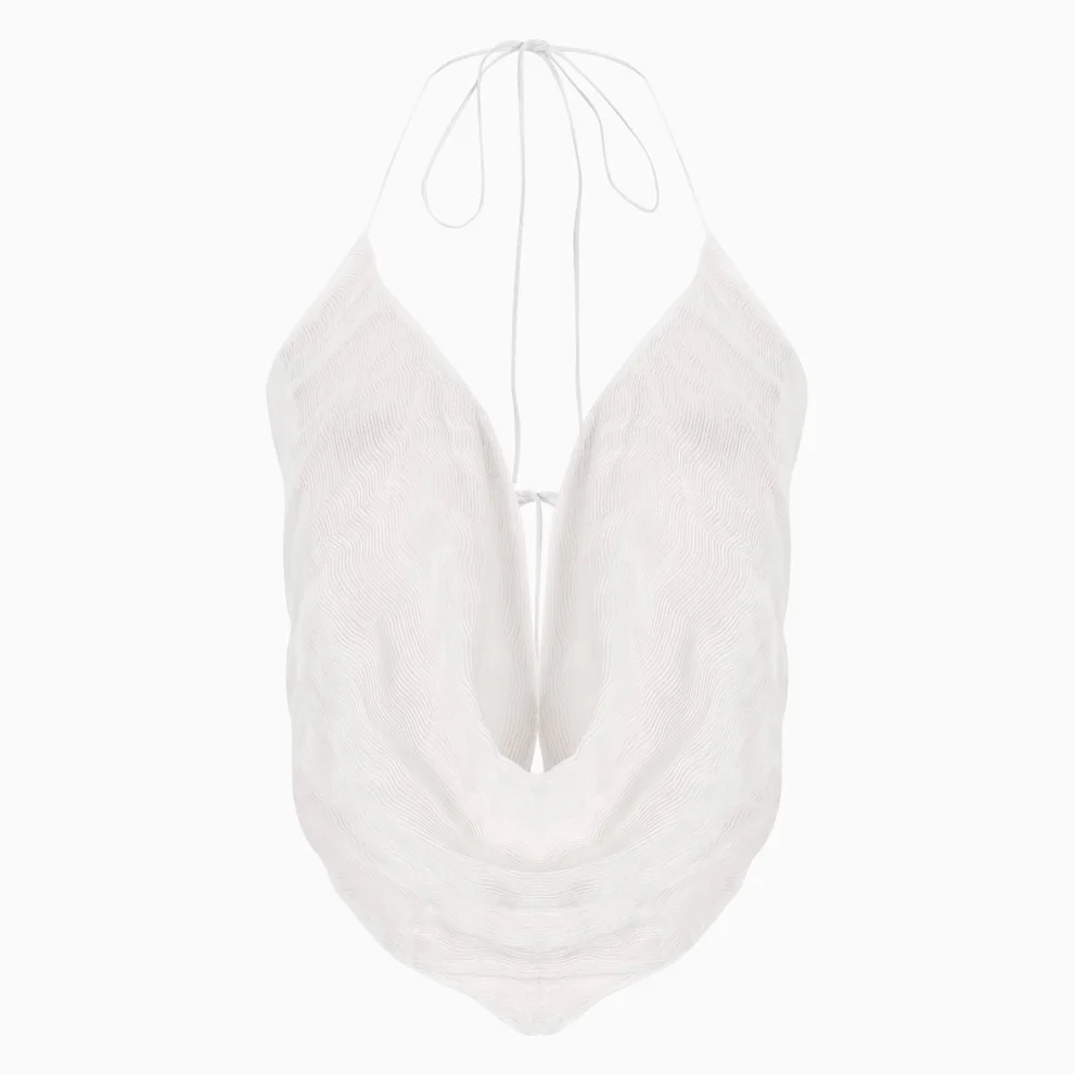 Flounced, degaje neckline, rope straps, backless, semi-transparent, flowing blouse.