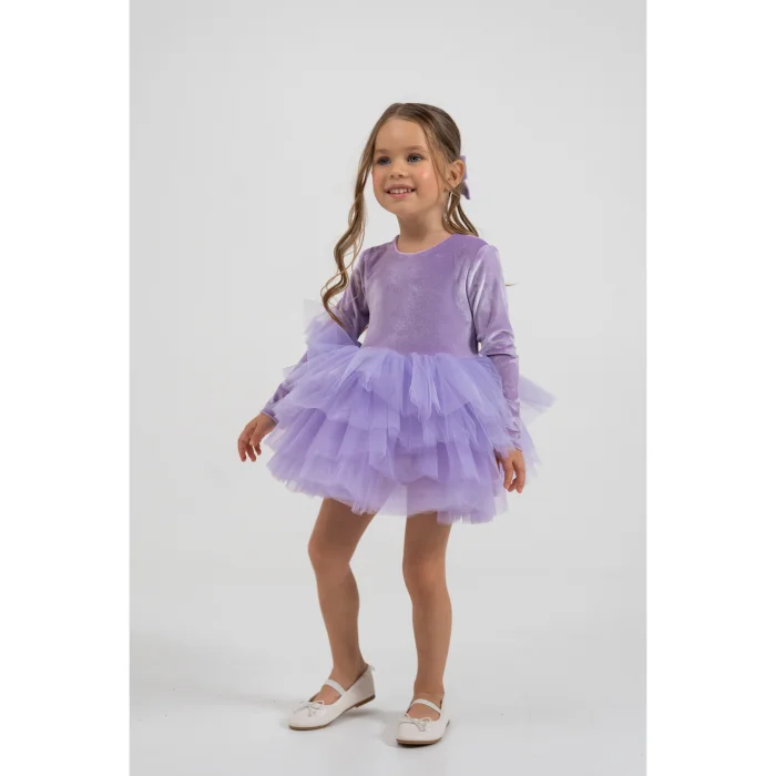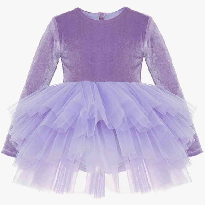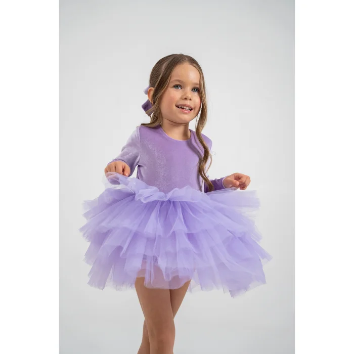 Lilac velvet tutu dress with crewneck and pat closure detail at the back. It has a lining in the form of a swimsuit with snaps under the tutu skirt.
